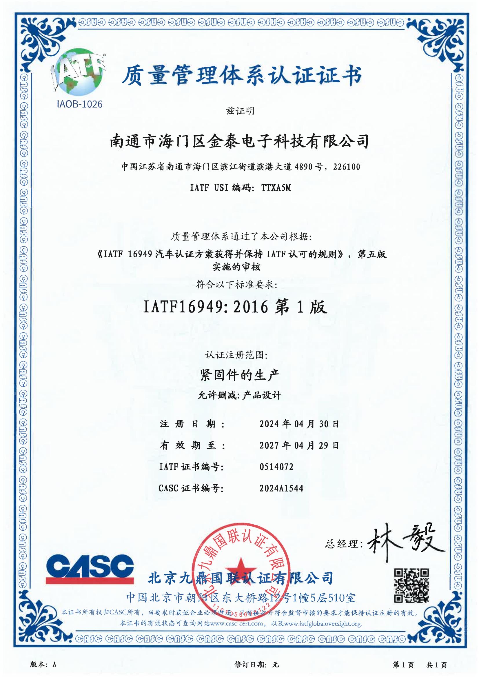 金泰緊固件獲得專業認證